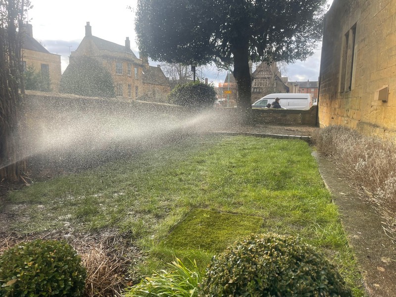 - Job description – Installation of tap based irrigation systems covering planting, pots and containers to rear garden and using above ground sprinklers to provide a simple solution to irrigating a small lawn which had struggled to grow due to its dry aspect.